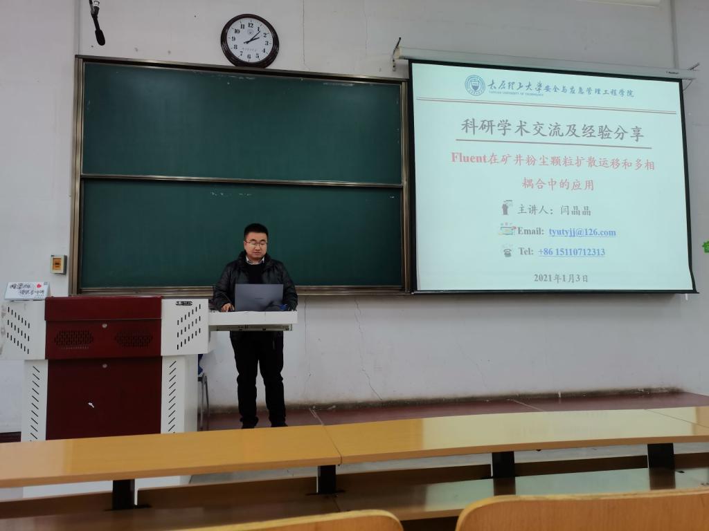 本次学术交流会分为博士报告、老师点评、提问讨论三个环节。闫晶晶博士以粉尘防治为背景,详细介绍了Fluent在矿井粉尘颗粒扩散运移和多相耦合中的应用,提出了自己的科研经验和建议。刘红威老师和高亚斌老师分别对报告内容做出了点评,两位老师对闫晶晶博士的报告内容表示充分的肯定与赞扬。高老师结合自身科研经历给研究生提出了相关经验和建议,对研究生提出了新的期盼和希望。部分研究生就科研问题与闫晶晶博士进行了激烈的交流讨论。