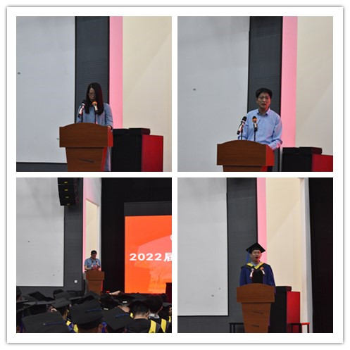 典礼在2022届毕业季MV和嘹亮的国歌声中拉开帷幕。邓存宝院长给全体毕业生送上祝福与殷切期盼,他希望同学们坚定理想、开拓创新、学会感恩、终生学习。教师代表赵耀江教授给毕业生送出了美好寄语,并告诉同学们努力奋斗之时,也不要忘记常回家看看。学生代表胡斐同学对母校的栽培,老师的辛勤付出,以及身边每一位同学的陪伴表达了最真诚的感谢。