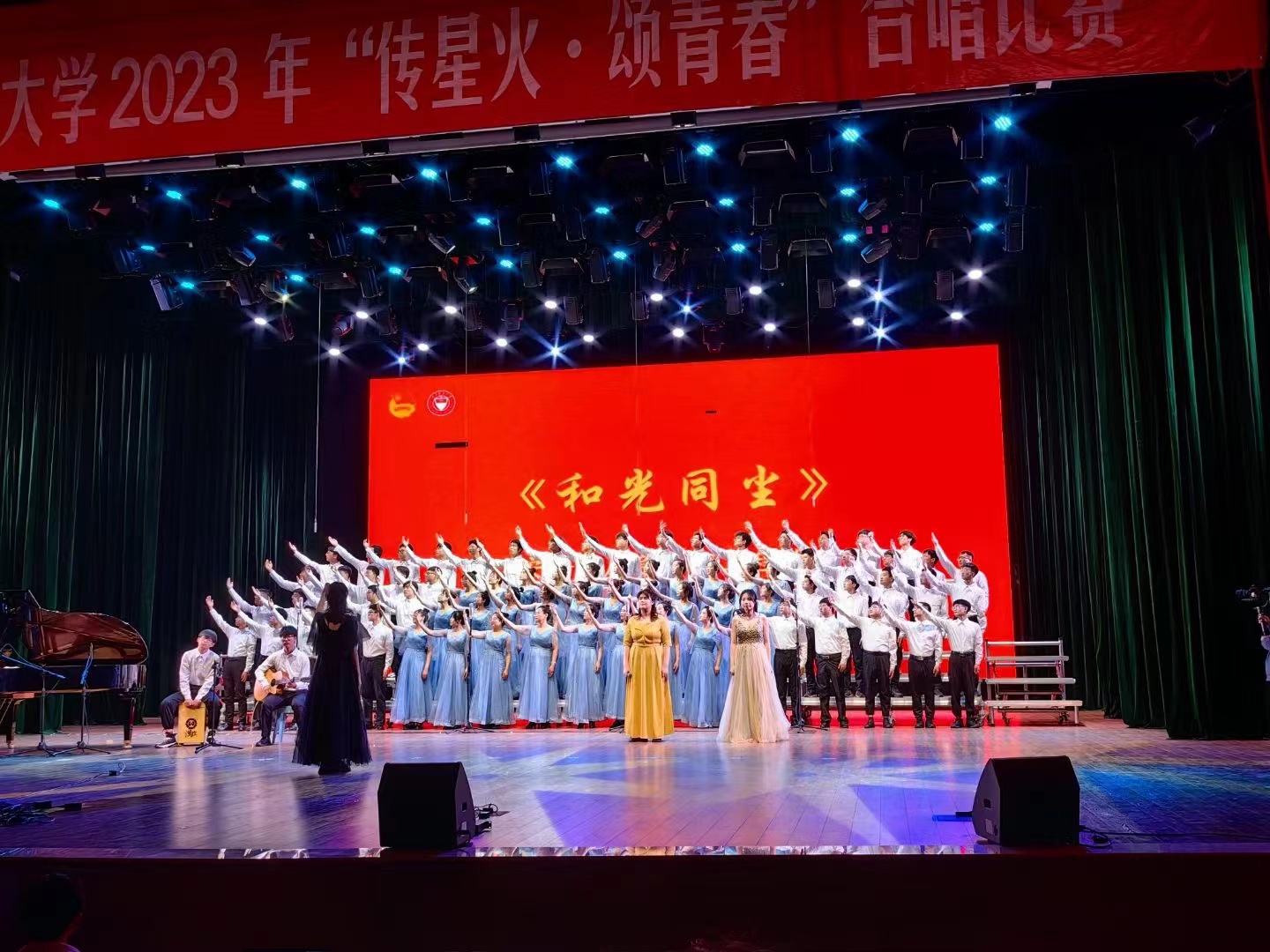 5月7日下午14:00,永利集团3044官网欢迎您由80名师生组成的合唱团参加了校团委举办的“传星火·颂青春”合唱比赛,参赛曲目为《和光同尘》。
